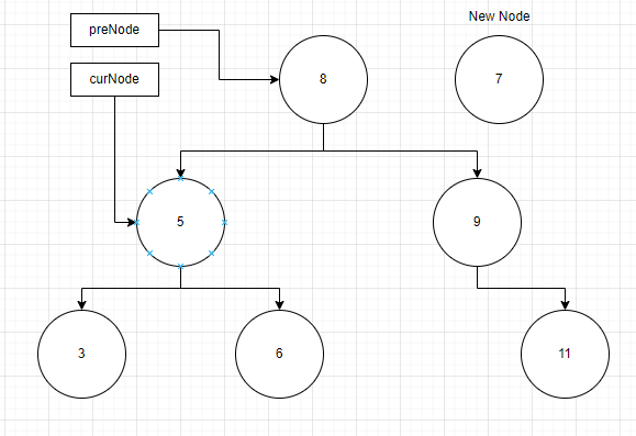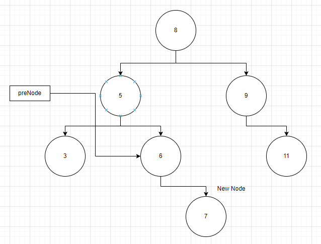 여기서 아직 curNode 가 다른 노드를 가리키고 있기 때문에 while 문을 계속 수행합니다. curNode 가 가리키는 노드의 데이터는 5이고 이는 새 노드의 데이터 크기보다 작으므로 curNode는 6을, preNode 는 5를 가리키게 됩니다.