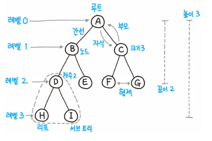 - 깊이 : 루트노드에서 어떤 노드까지의 간선의 수