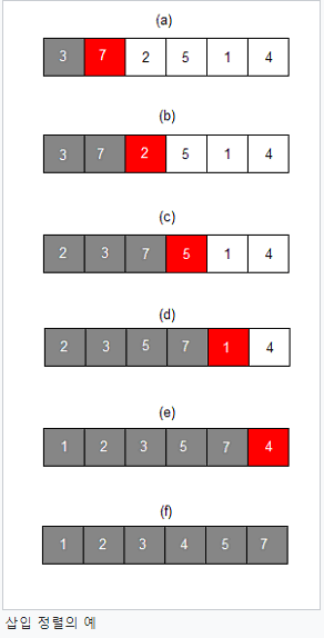 맨 처음 3은 정렬되어있다고 가정하고 7 부터 검사합니다. 7이 3보다 작은지 검사하고 그렇지 않은경우 다음 인덱스로 이동합니다.